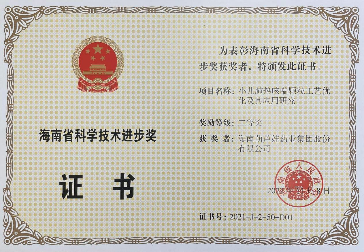 为此,小儿肺热咳喘颗粒的制备方法获得了第二十一届中国专利优秀奖(2019年),专利申请号:ZL201010134951,此次作为专利技术的应用,获得了2021年度海南省科学技术进步奖二等奖。在此之前,贝斯特牌小儿肺热咳喘颗粒还多次被授予“临床价值中成药品牌”、“中国连锁药店最具合作价值单品”,荣登“中国医药品牌榜”。